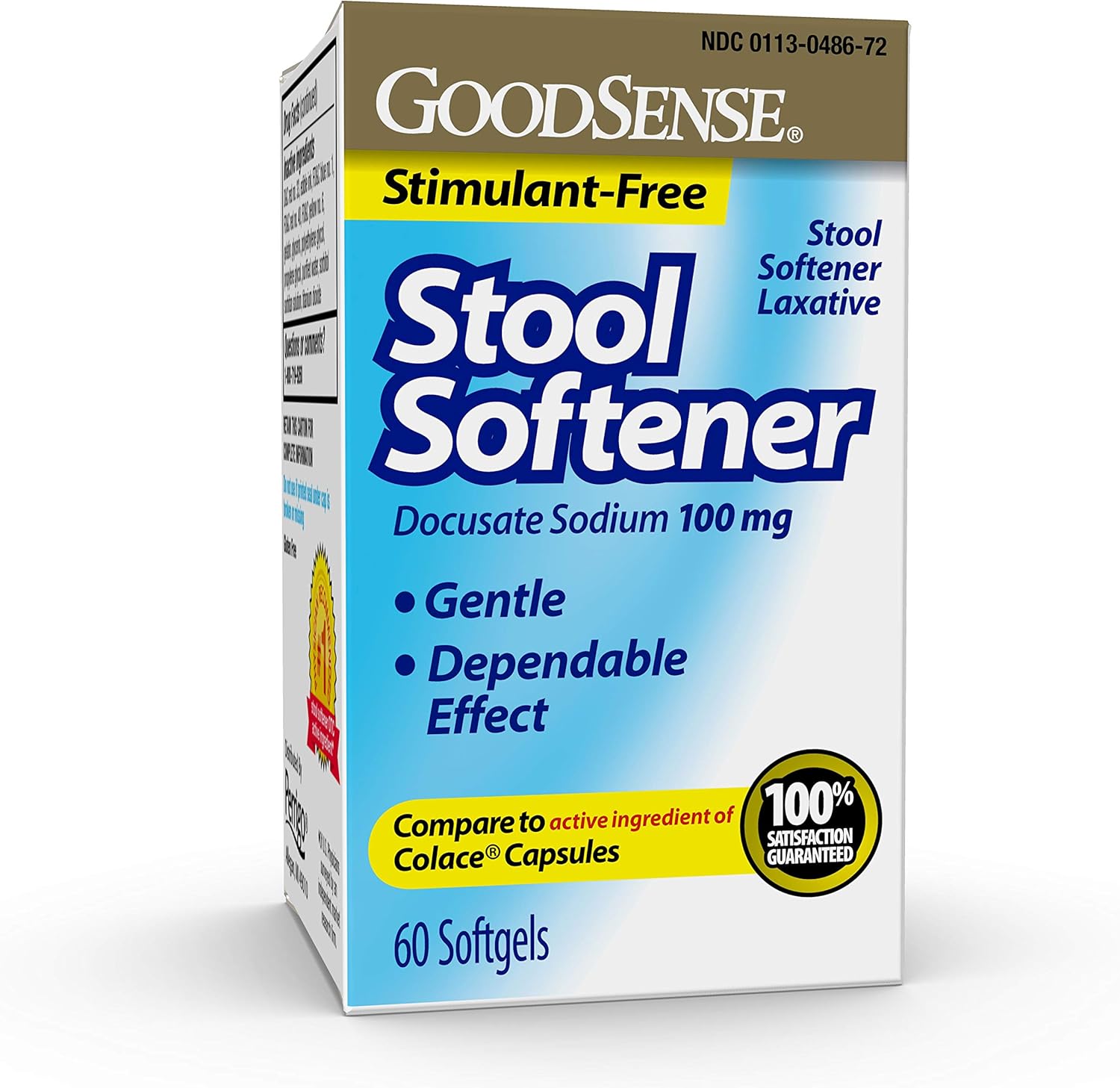 Doc-Q-Lax Docuzen DOK Plus GoodSense Stimulant Laxative Laxacin show all 17 brand names. Colace regular strength stool softener is a stimulant free stool softener providing gentle dependable effective and comfortable relief from occasional constipation in 12 to 72 hours. It draws water into your colon which is intended to soften your bowel movements for greater comfort and ease.